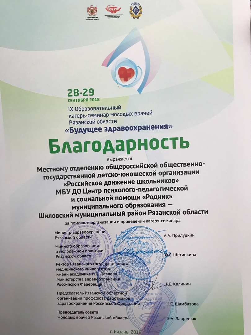 28 сентября активисты местного отделения Российского движения школьников-волонтёры отряда «Истоки» МБУ ДО Центра «Родник» Шиловского района во второй раз были приглашены на образовательный лагерь-семинар молодых врачей Рязанской области “Будущее здравоохранения”, который проходил на базе оздоровительного комплекса «Звёздный» Спасского района.