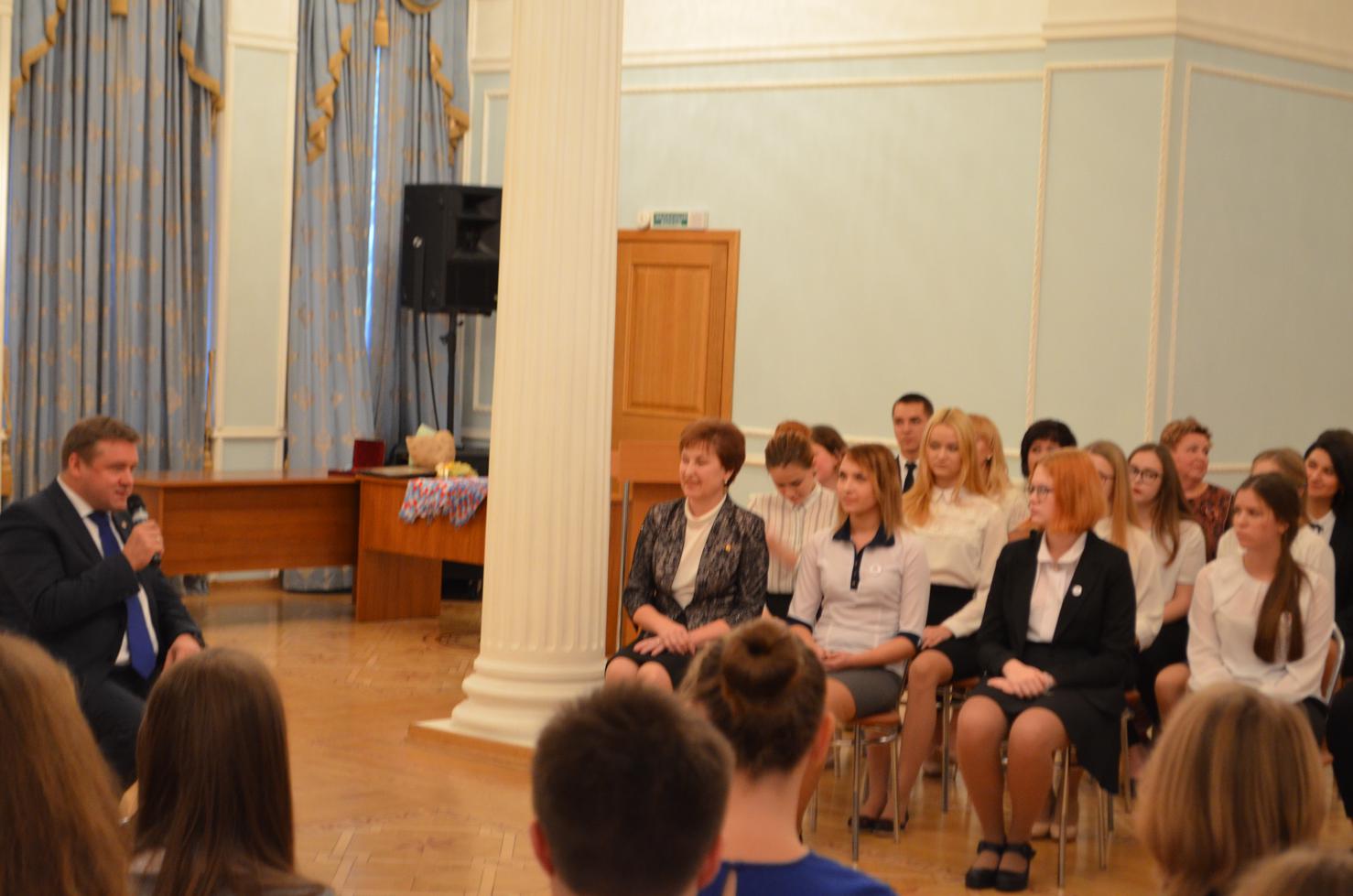 Глава региона поприветствовал ребят и сказал, что Российское движение школьников предоставляет им возможности для саморазвития, реализации себя, дает подросткам уверенность в собственных силах, помогает определиться с будущей профессией. В ходе встречи Николай Любимов ответил на вопросы активистов РДШ. А затем ребятам в торжественной обстановке была вручена символика движения. Галстуки расцветки «триколор» 50-ти ребятам вместе с Николаем Любимовым повязали министр образования и молодежной политики региона Ольга Щетинкина, председатель областного отделения РДШ Сергей Хлыстов и региональный координатор движения Татьяна Косачева.