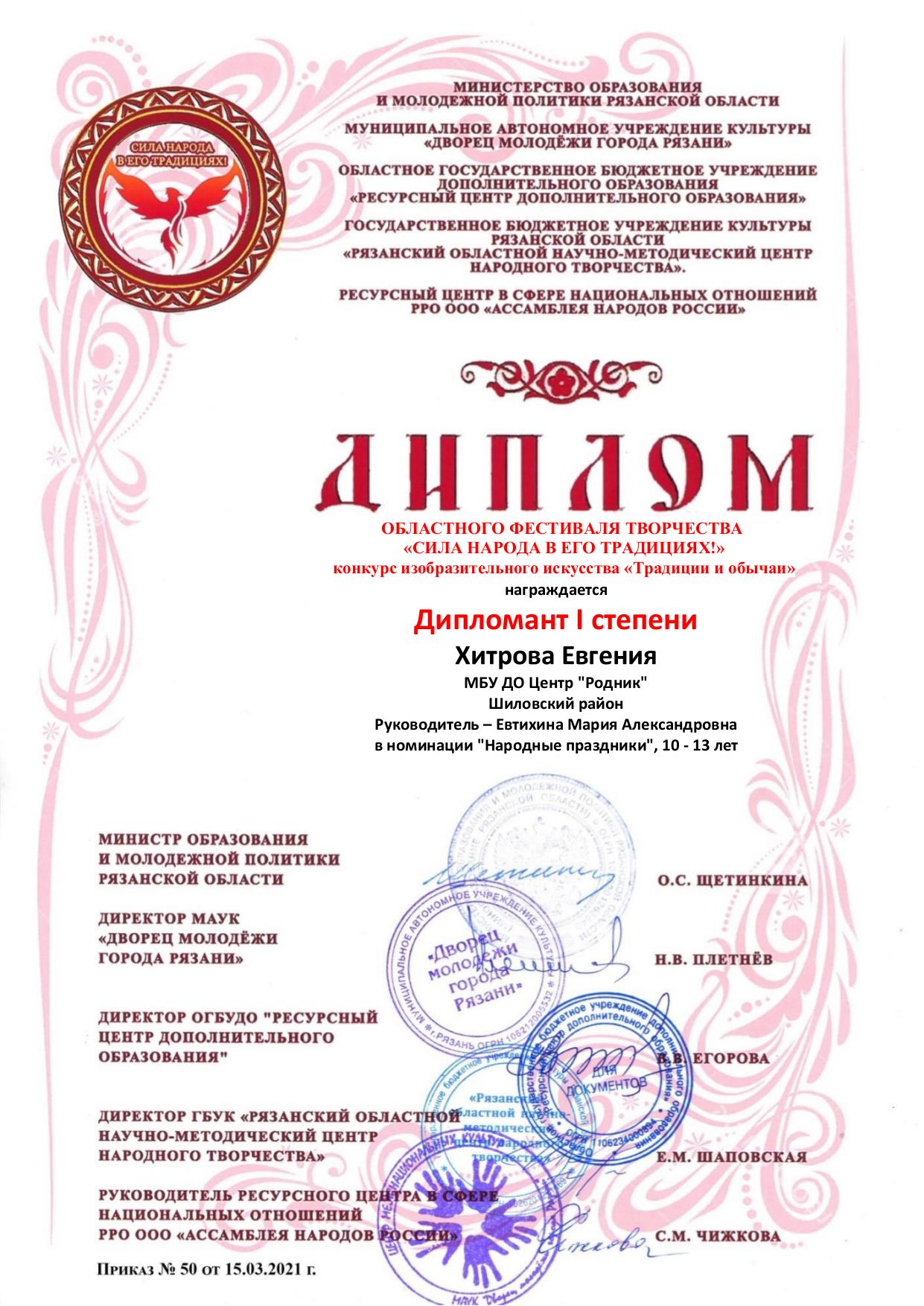 Победителем фестиваля в конкурсе изобразительного искусства «Традиции и обычаи» в номинации «Народные праздники» (10-13 лет) стала Хитрова Евгения, дипломант II степени, руководитель Евтихина М.А.