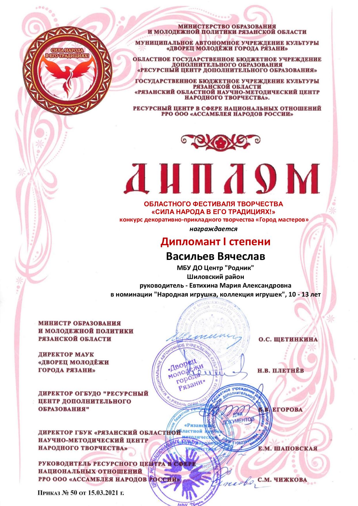 - Васильев Вячеслав, дипломант I степени в номинации «Народная игрушка» (10-13 лет), руководитель Евтихина М.А.;