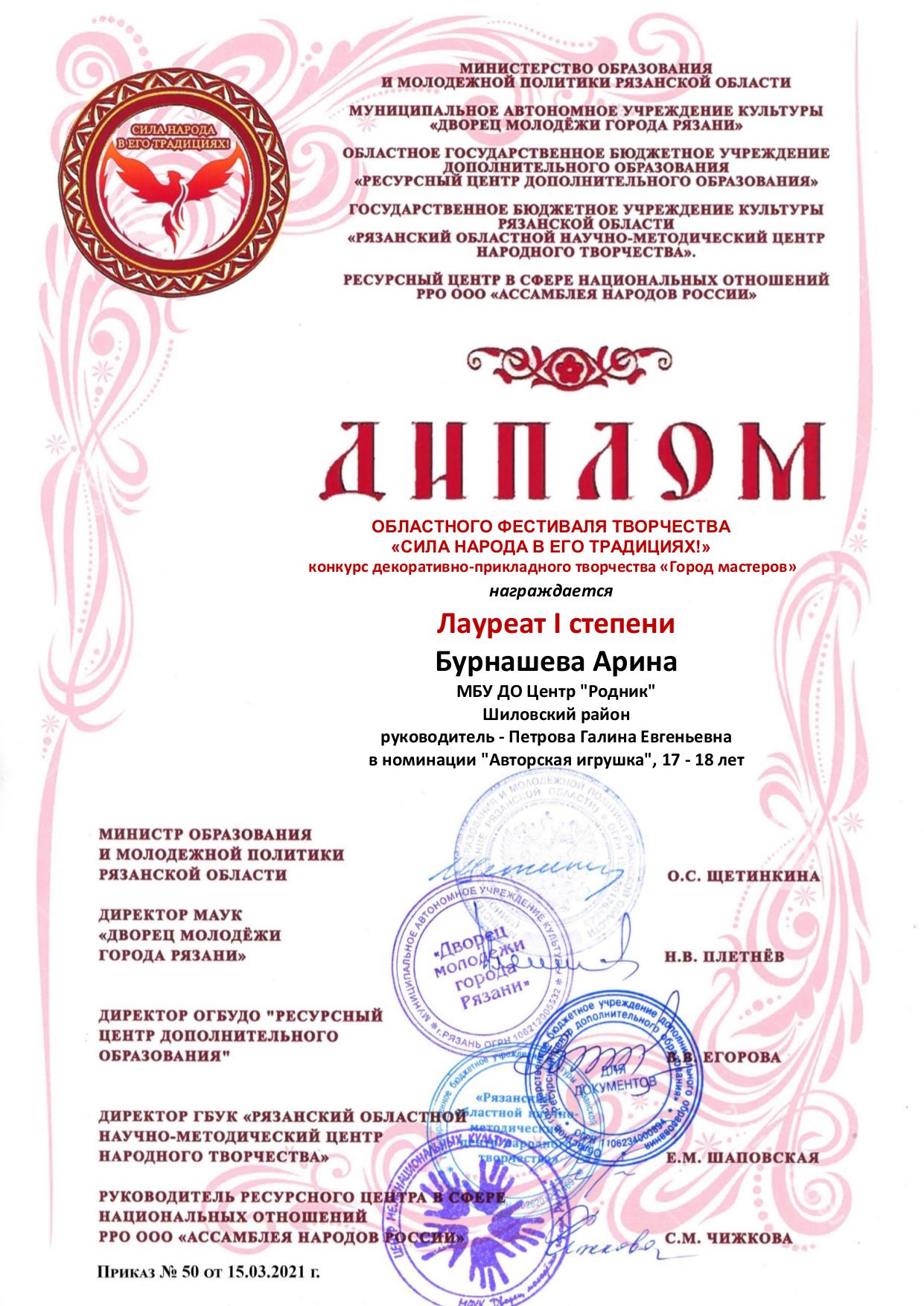 - Бурнашева Арина, лауреат I степени в номинации «Рязанский гриб» (17-18 лет), лауреат I степени в номинации «Авторская игрушка» (17-18 лет), руководитель Петрова Г.Е.