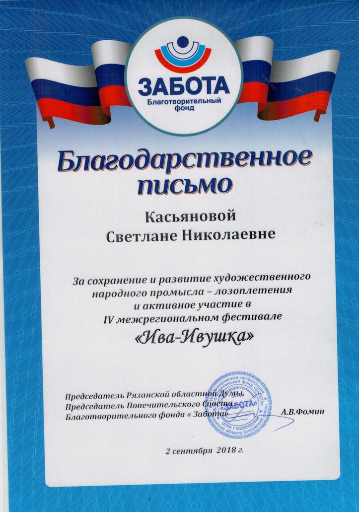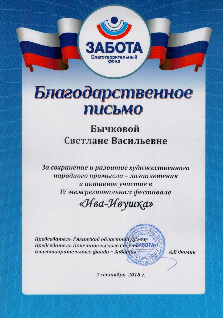 За свою активную работу педагоги награждены благодарственными письмами организационного комитета фестиваля и Председателя Рязанской областной Думы, Председателя Попечительского Совета Благотворительного фонда «Забота» А.В. Фомина. Поздравляем!