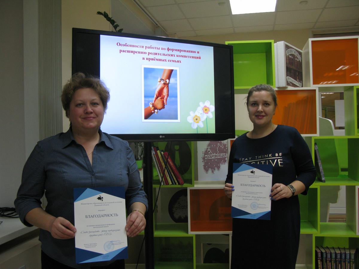 4 декабря 2018 года на базе ГБУК РО «Библиотека им. Горького» г. Рязань в рамках методической недели «Сетевое взаимодействие – фактор индивидуализации образования детей с ОВЗ» педагогами – психологами МБУ ДО Центр «Родник» Маняткиной В.А. и Фетисовой Н.А. было проведено родительское собрание с элементами тренинга для замещающих родителей и кандидатов в приёмные родители Рязанской области по теме: «Особенности работы по формированию и расширению родительских компетенций в приемных семьях». На собрании присутствовало 16 родителей и специалисты ГКУ РО «ЦППМСП» г. Рязань.