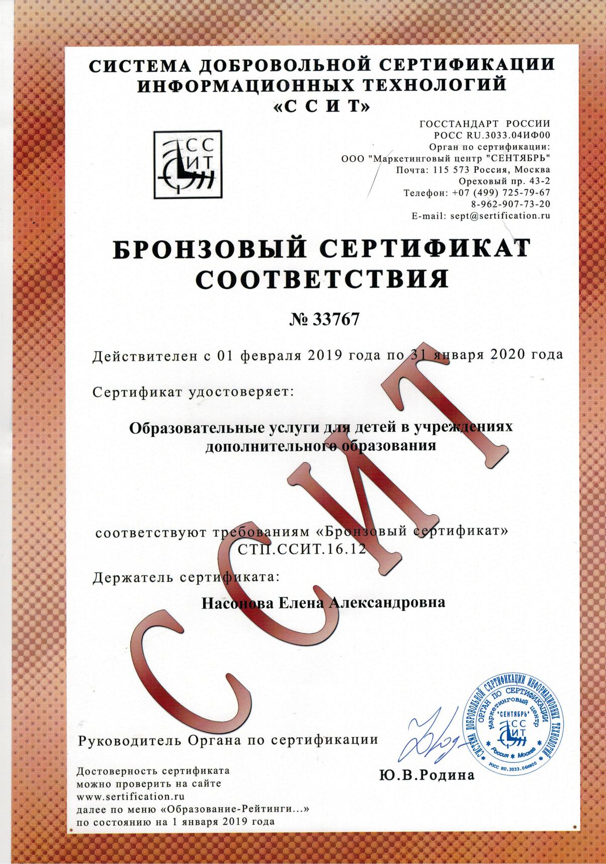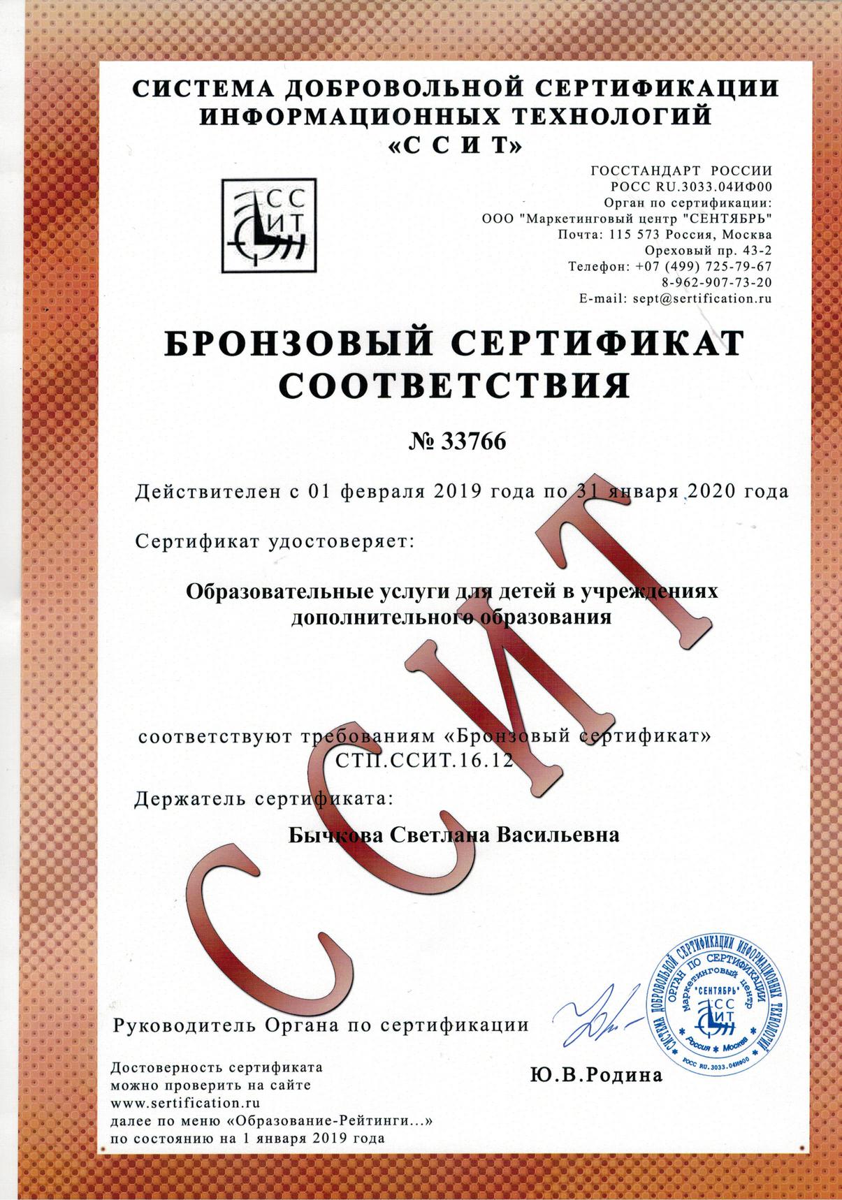 Педагоги дополнительного образования Бычкова С.В. (объединение «Бисероплетение»), Насонова Е.А. ) (объединение «Тестопластика») по результатам Всероссийского рейтинга педагогов вошла в 60 % лучших. Это подтверждает, что уровень образовательных услуг, оказываемых педагогами, соответствует требованиям «Бронзового сертификата». МБУ ДО Центр «Родник» также отмечен «Бронзовым сертификатом».